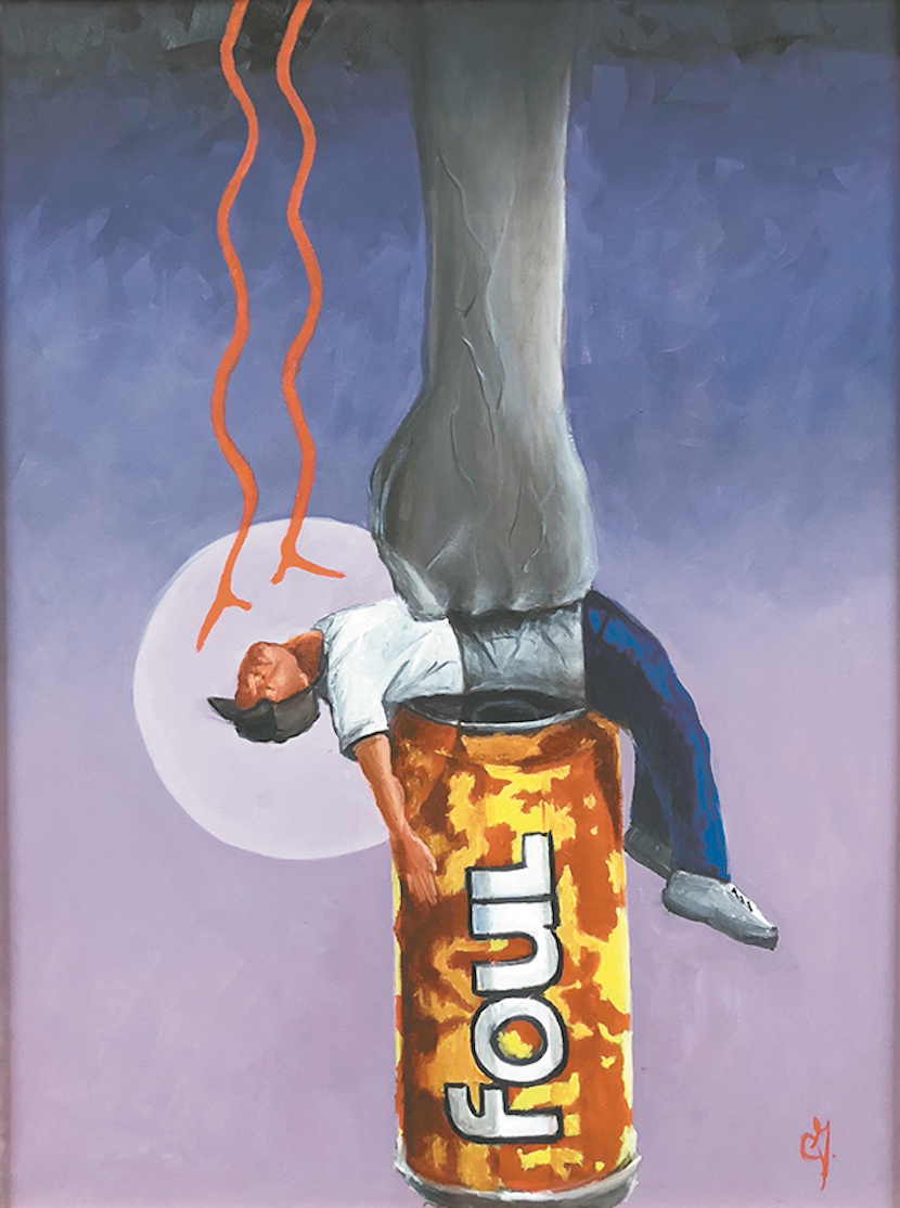 Joe, a Mille Lacs Band member, talked about each painting, beginning with the can of "Foul Lokto" on the painting of the first step. "I couldn't use the Four Loko can because of copy- right infringement," said Joe. "I was smart about that," he added, drawing laughter from his audience.