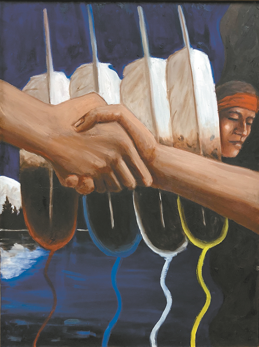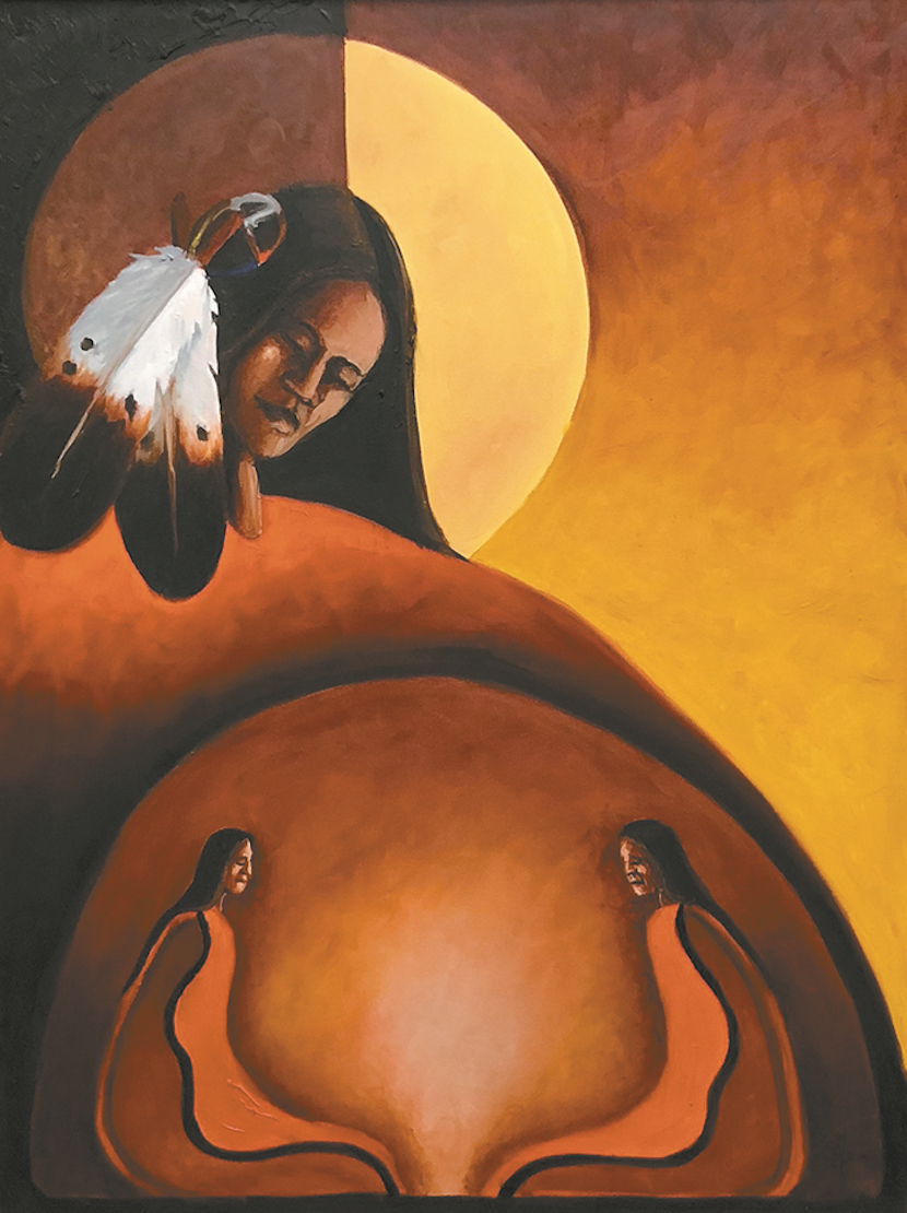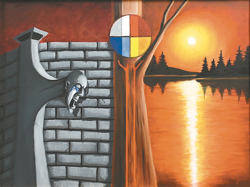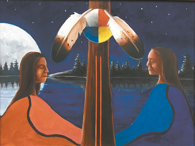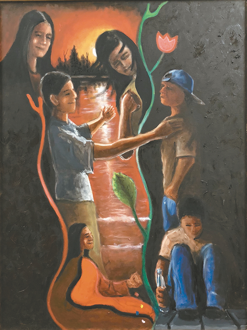 Step Twelve — Carrying the Message: "The dark side is on the right; they're lost and spiritually empty. The Ojibwe design represents the seed of sobriety. The people on the left, they're saying, 'Come on over to the light.'"