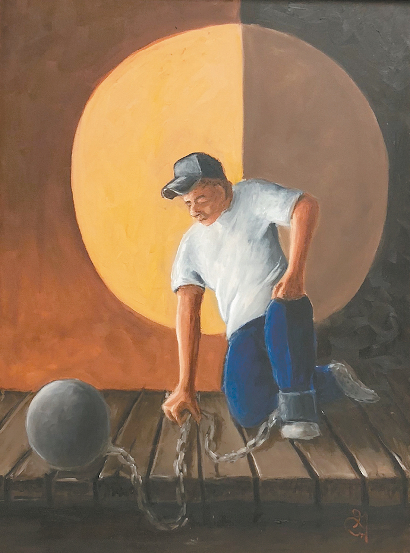 Step Six — Ready: "This person is ready to get up from all the chaos he went through, and the circle is the Creator, always behind him. The ball and chain are his defects of character, and he's ready to let them go." -
