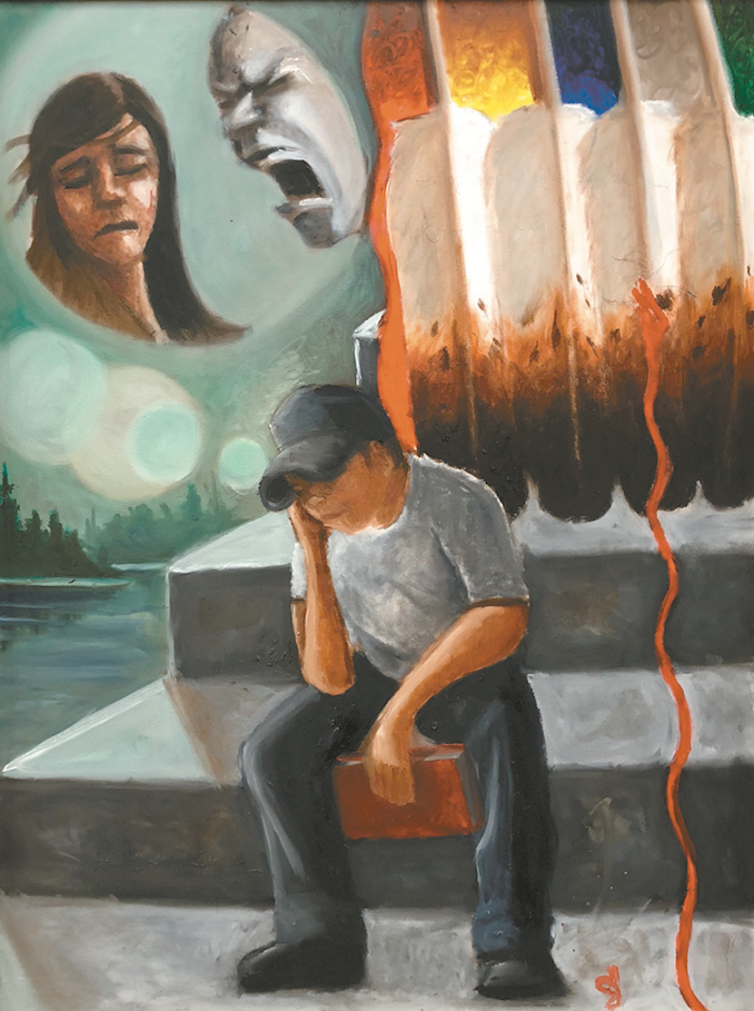 Step Three — Made a Decision: "This person is sitting down at a sweat lodge, being honest with himself, looking at how Mother Earth is always reminding us, and the circle represents the Creator, who is always with us in the dark times." -