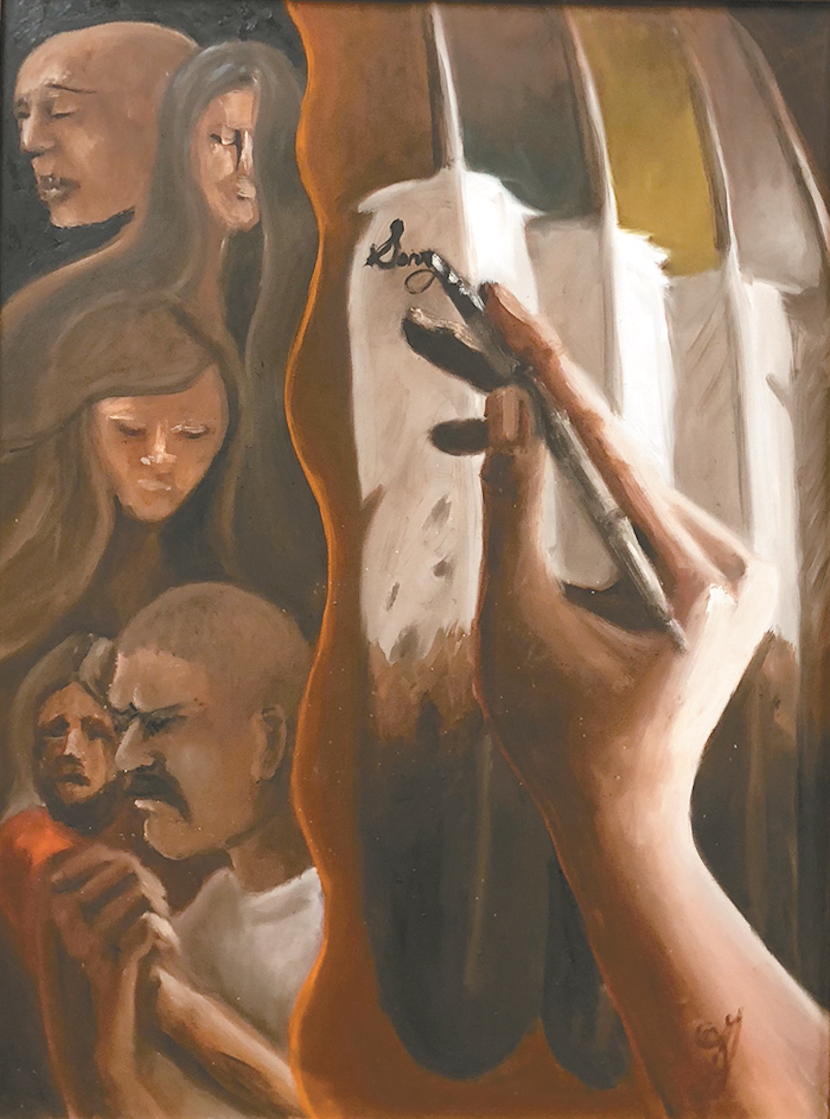As he spoke about the paintings, a few themes emerged: the importance of the higher power or Creator, symbolized by the circles in several of the paintings; the significance of "we" in the first step (We came to believe...), showing the importance of community in recovery; and the "seed of sobriety," symbolized by the Ojibwe-style vine in the final painting.