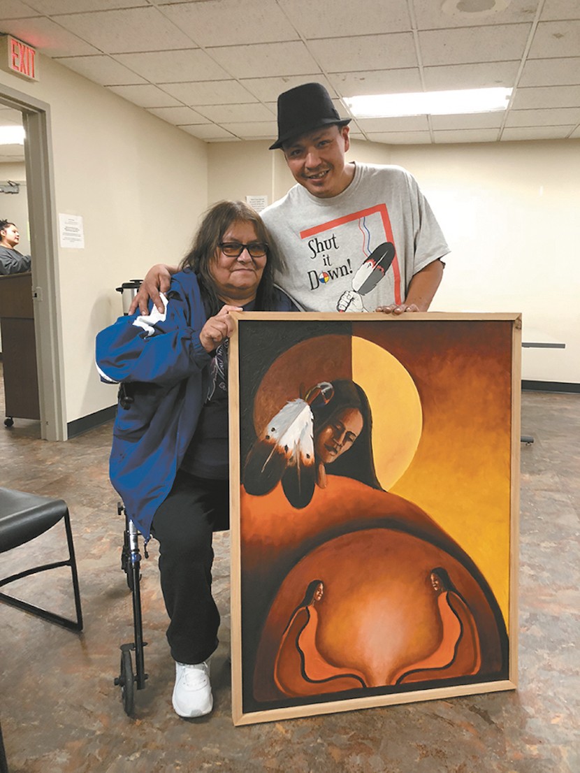 Photo: Joe Gurneau was joined by his mom, Marilyn, at the unveiling of Joe's artwork. Joe is grateful to his mom for "kidnapping" him and bringing him to Mille Lacs, where he was able to find healing.