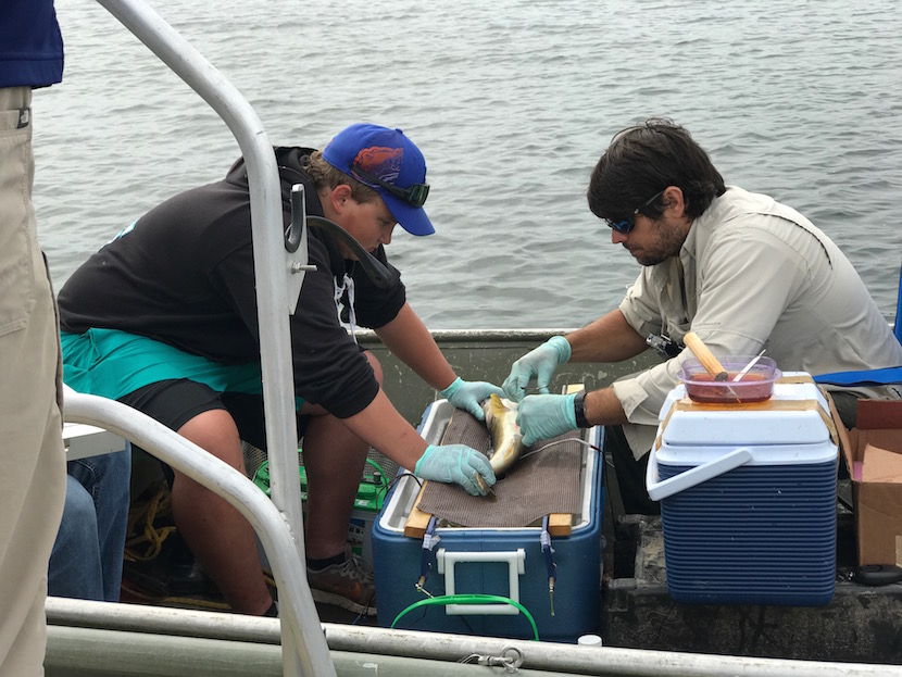 Below: Dr. Aaron Schultz (right) and intern Brandon Johnson of GLIFWC inserted tracking devices in walleyes as part of the Mille Lacs Band's groundbreaking new study on Mille Lacs.**