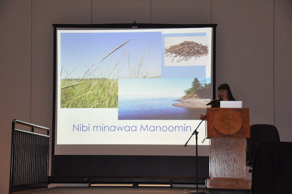 Secretary-Treasurer Carolyn Beaulieu gave a welcoming address, telling the story of the Anishinaabe who migrated to the land “where food grows on water.” She stressed the importance of protecting manoomin by working together and valuing both scientific and cultural perspectives.