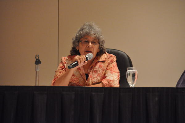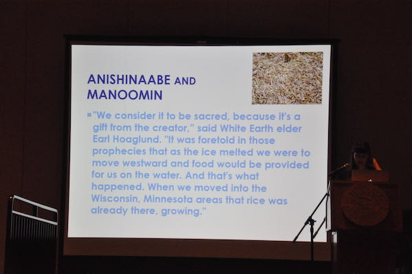 After the welcoming addresses, a panel of four rice experts spoke. Mille Lacs Band Wildlife Biologist Kelly Applegate talked about the Band’s efforts with water quality, restoration and wildlife habitat. Lisa David of the Great Lakes Indian Fish and Wildlife Commission spoke about carp and beaver control, genetic engineering, seeding, and unusual weather events resulting from climate change.