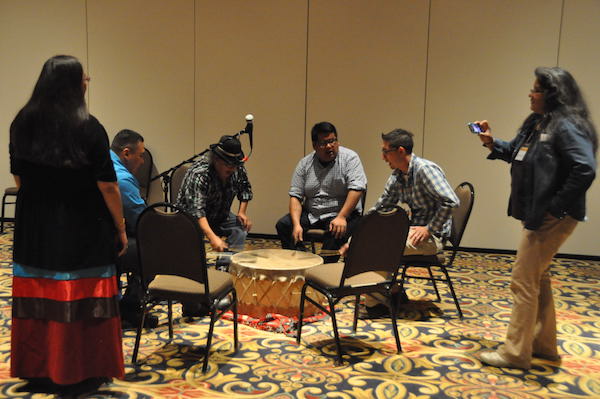 The symposium began with an invocation from Byron Ninham, a drum song by Timber Trails, and a water ceremony by Dorene Day of the Bois Forte Band.