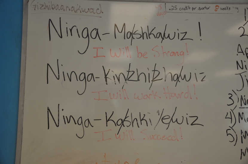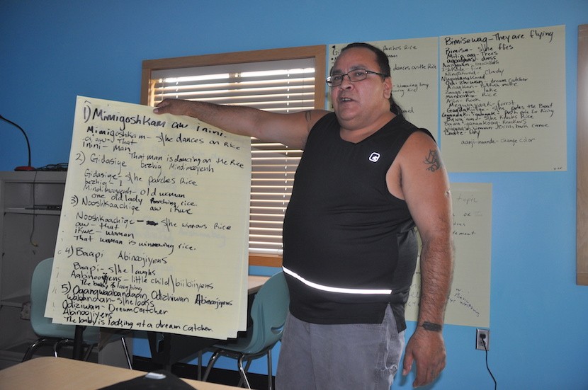 The importance of language is evident all over the walls in the high school classroom. Ojibwe words and sentences and labeled pictures adorn every empty space.