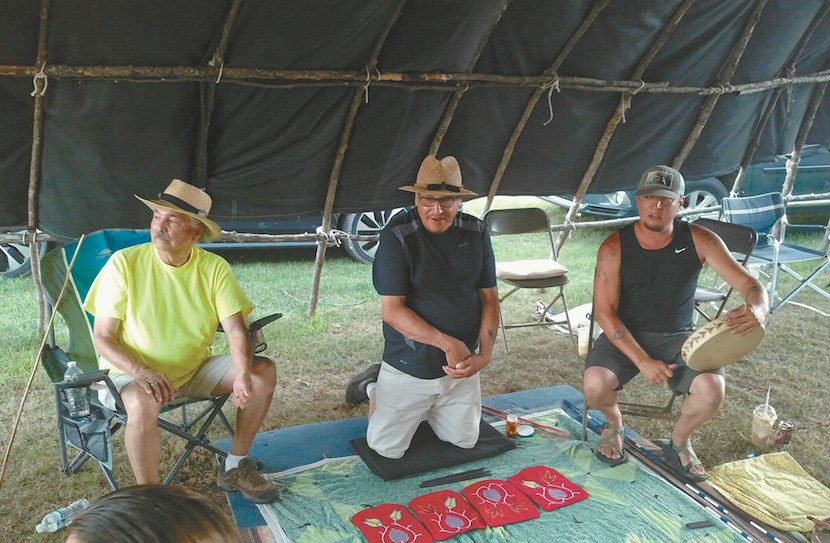 Above: Dave Sam's team played makazinataagewin, the moccasin game, at the Mash-ka-wisen Veterans Powwow.