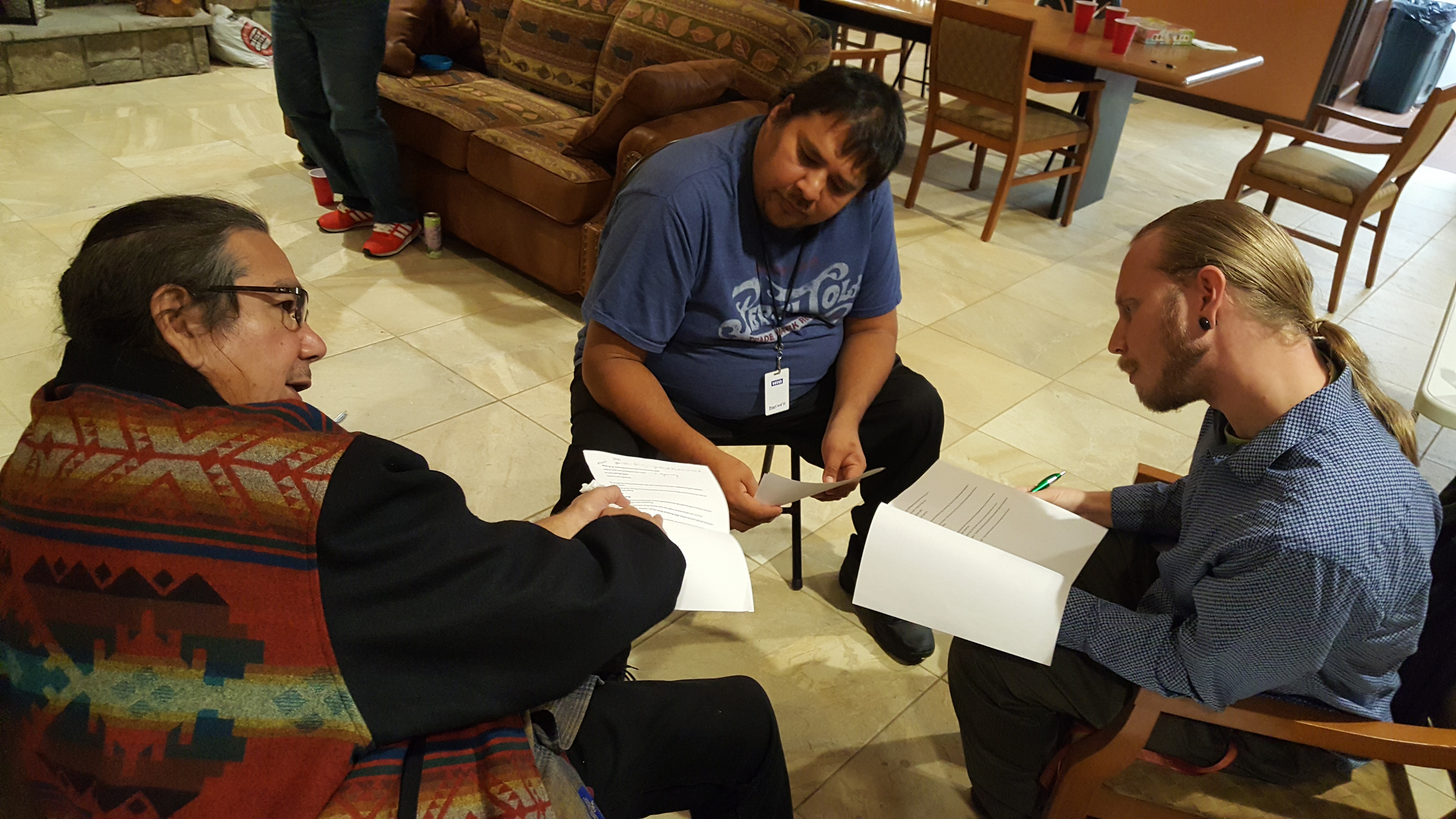Bright and early the next morning, the youth were broken up into two groups and paired with either Waabishkigaabaw or Bagwajinini. They were given a set of Creativity Storytelling dice, and away they went on their own storytelling and creative journeys together. (Storytelling dice have pictures of actions, things, and places that spur creativity around a table by having to incorporate whatever item shows up on the dice into the story that the group is taking turns telling together.) There were many vibrant stories coming out of this process. There was a boy who worked so hard on sewing a blanket for a ceremonial dance that he fell asleep the night of the dance and never got to give it to the apple of his eye; to a deep story about bullying that involved the bully having to experience the pain that he caused others. In the end, two completely different stories were chosen as the stories that the two groups would work on for the rest of the camp.