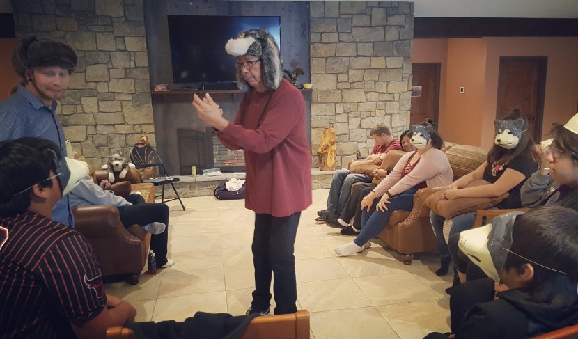 After the dice game, the youth were treated to a guest appearance by District II Representative, and talented theatrical mastermind, David “Niib” Aubid. Niib came and told the youth numerous stories. One in particular was about a pack of wolves that encountered someone who admired them and wanted to have all of their amazing traits. Niib had the youth wearing wolf masks and up howling along with him; he also took them on a wolf pack journey around the building in search of a nice place to take a rest. He then switched gears to a story about butterflies and helped the kids each create their own finger puppet, which he then told them he would use in his future storytelling endeavors. The youth were grateful and excited about Niib’s performance, and they couldn’t wait to share their story ideas with him as well. Niib stayed and mentored the youth on their forming stories and helped the language instructors finesse any language that he thought needed tweaking. Waabiskigaabaw and Bagwajinini took full advantage of their time with a master speaker and had plenty of sidebar conversations with him about language usage and grammar.
