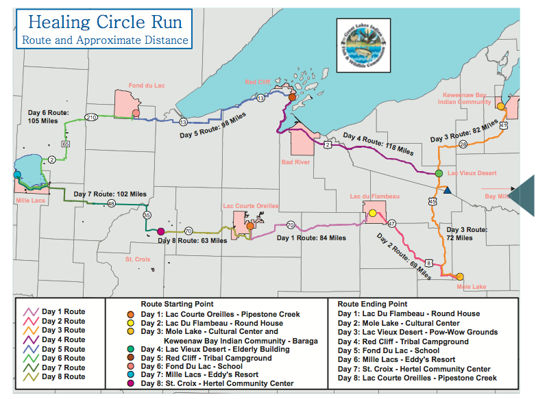 The 2019 Healing Circle Run on July 13–20 connects 10 Ojibwe reservations in northern Wisconsin, Michigan, and Minnesota. The 2019 Healing Circle Run/Walk is a prayer for healing.