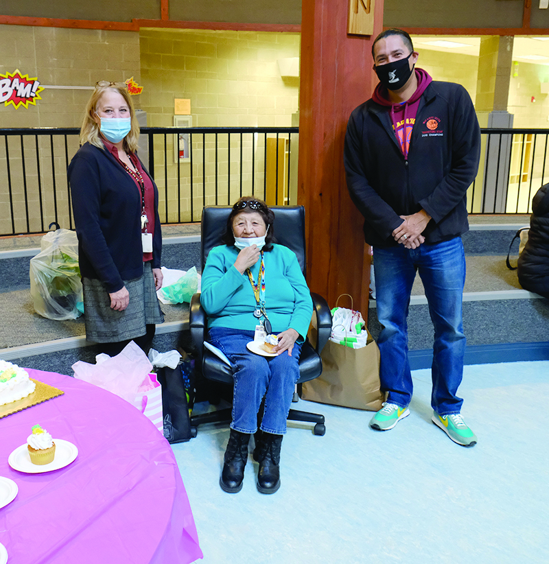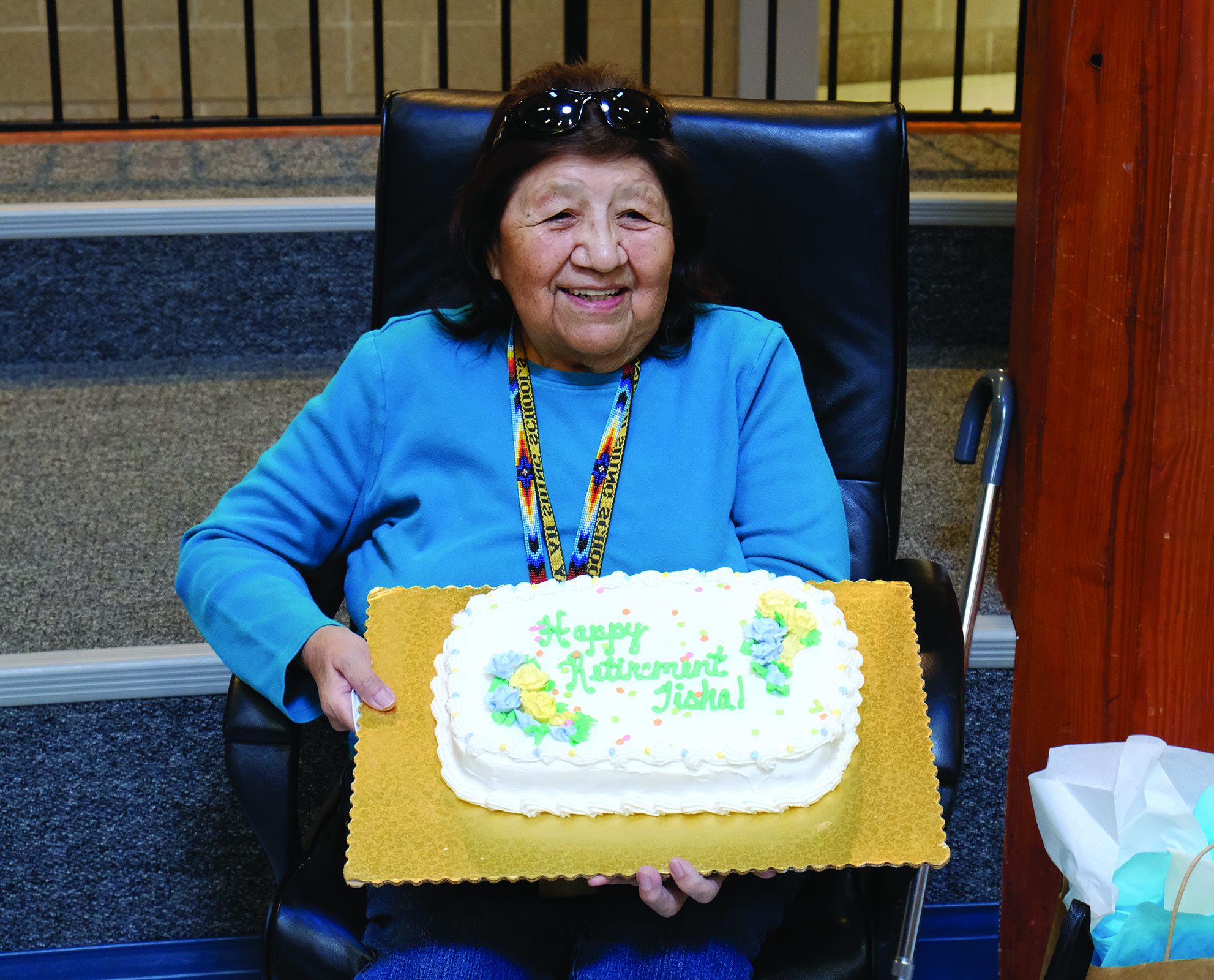 Photos: Letitia Mitchell was honored for 46 years of service to Nay Ah Shing Schools on Thursday, December 3. Among the well-wishers were Commissioner of Education Joyce Shingobe and Chief Executive Melanie Benjamin and (pictured above) Nay Ah Shing Principal Lehtitia Weiss and Assistant Principal Byron Ninham. Letitia was famous for her baking power biscuits (made from scratch with no recipe), and her banana bread, which she regularly brought to share with co-workers.