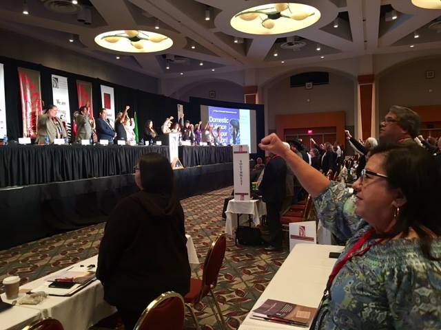 Attendees at the NCAI General Assembly meeting raised their fists in solidarity with ending domestic violence.
