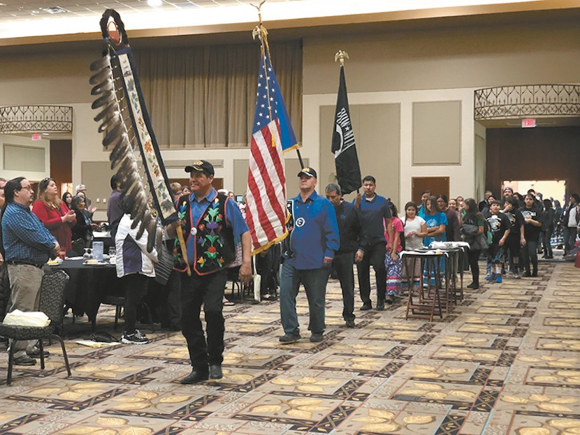 Timber Trails drum group played Grand Entry, Flag, and Veterans songs, and Elder Joe Nayquonabe Sr. gave the invocation.