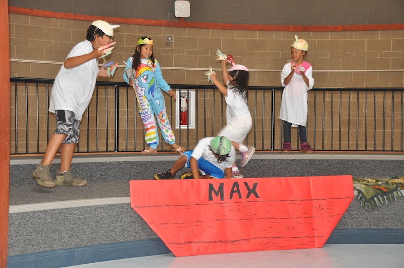 On the last day of summer school, June 28, Blenda Hag- berg and Sandi Jellum's theater students performed for parents, friends, and community members, who were also i vited to come for lunch. The younger kids performed nursery rhymes, including some in Ojibwe, and the older kids put on a stage version of Where the Wild Things Are — and a wild rumpus it was!