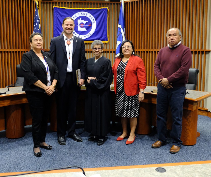 Caleb Dogeagle was sworn in on Wednesday, May 1, as Mille Lacs Band Solicitor General. Associate Justice Ramona Applegate of the Court of Appeals administered the oath of office: "I, Caleb Dogeagle, do hereby swear that I will support, honor and respect the Constitution of the Minnesota Chippewa Tribe and the laws of the Non-Removable Mille Lacs Band of Chippewa Indians, and I will protect the rights of Band members and others under the jurisdiction of the Non-Removable Mille Lacs Band of Chippewa Indians, and that I will faithfully and impartially discharge the duties of the office to the best of my judgment and ability so help me gi chi ma ni do."