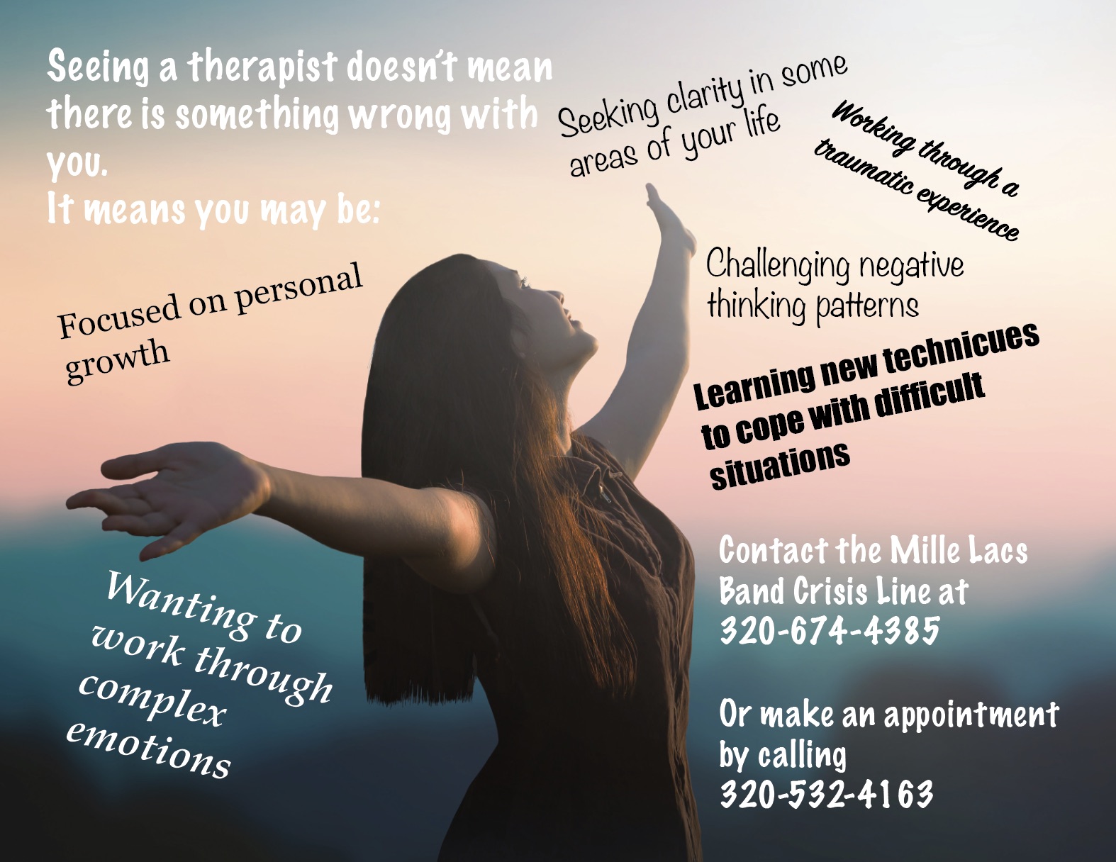 In times of uncertainty or when we don’t feel safe, our mental health may suffer. At times, you don’t recognize that your mental health is suffering. You might feel more on edge than usual, irritated, hopeless, or sad. You might feel more upset with others or want to avoid any reminders of what is occurring. For those who already struggle with your mental wellness, you might feel depressed or anxious, or you may lack motivation to carry out your daily routine. If you are struggling and feel alone, or you have any questions, please reach out to the MLBO Mental Health Department crisis phone line at 320-674-4385. Contact Ne-Ia-Shing Clinic at 320-532-4163 for any questions and to make an appointment with a therapist.