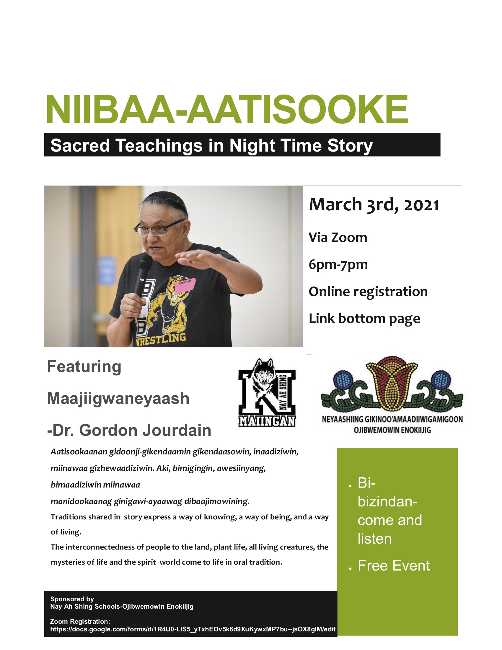 Join Maajiigwaneyaash Dr. Gordon Jourdain on March 3 from 6 to 7 p.m. for Niibaa-Aatisooke — Sacred Teachings in Night Time Story, sponsored by Nay Ah Shing Schools-Ojibwemowin Enokiijig. To register, go to https://docs.google.com/forms/d/1R4U0-LlS5_yTxhEOv5k6d9XuKywxMP7bu--jsOX8glM/edit. The event will also be streamed live on the Nay Ah Shing Facebook page.