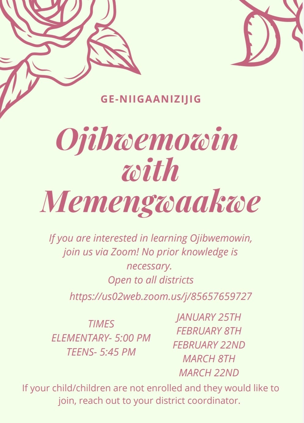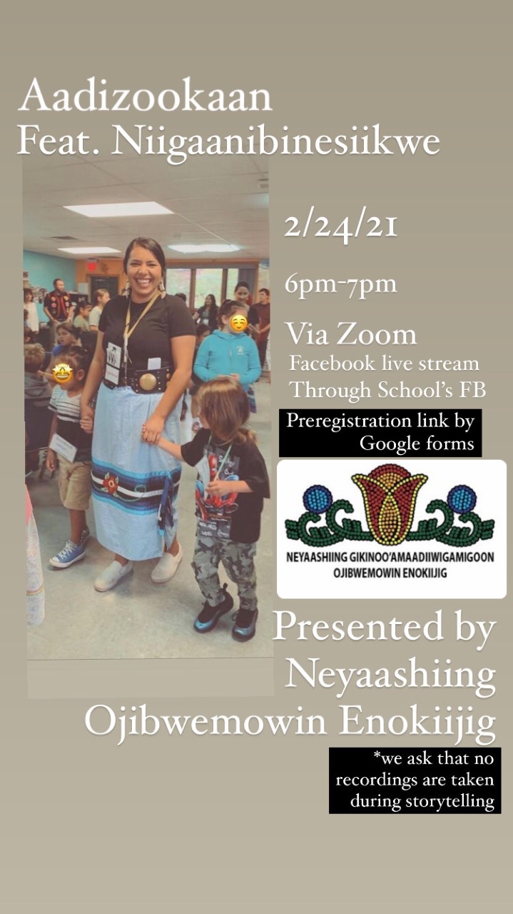Neyaashiing Ojibwemowin Enokiijig invites you to the first storytelling series featuring Niigaanibinesiikwe/Hannah Orie on Wednesday, February 24. Preregistration is https://docs.google.com/forms/d/1LvpqU-1qH-VlD7GLDu0t5qNnnmFkcdmt3KHFfLWyoVc/edit. A Zoom link will be sent out 48 hours prior to event to the email submitted, and the event will also be live streamed through the Nay Ah Shing School's Facebook page. See below for information on another Aadizookewin event scheduled for March 3.