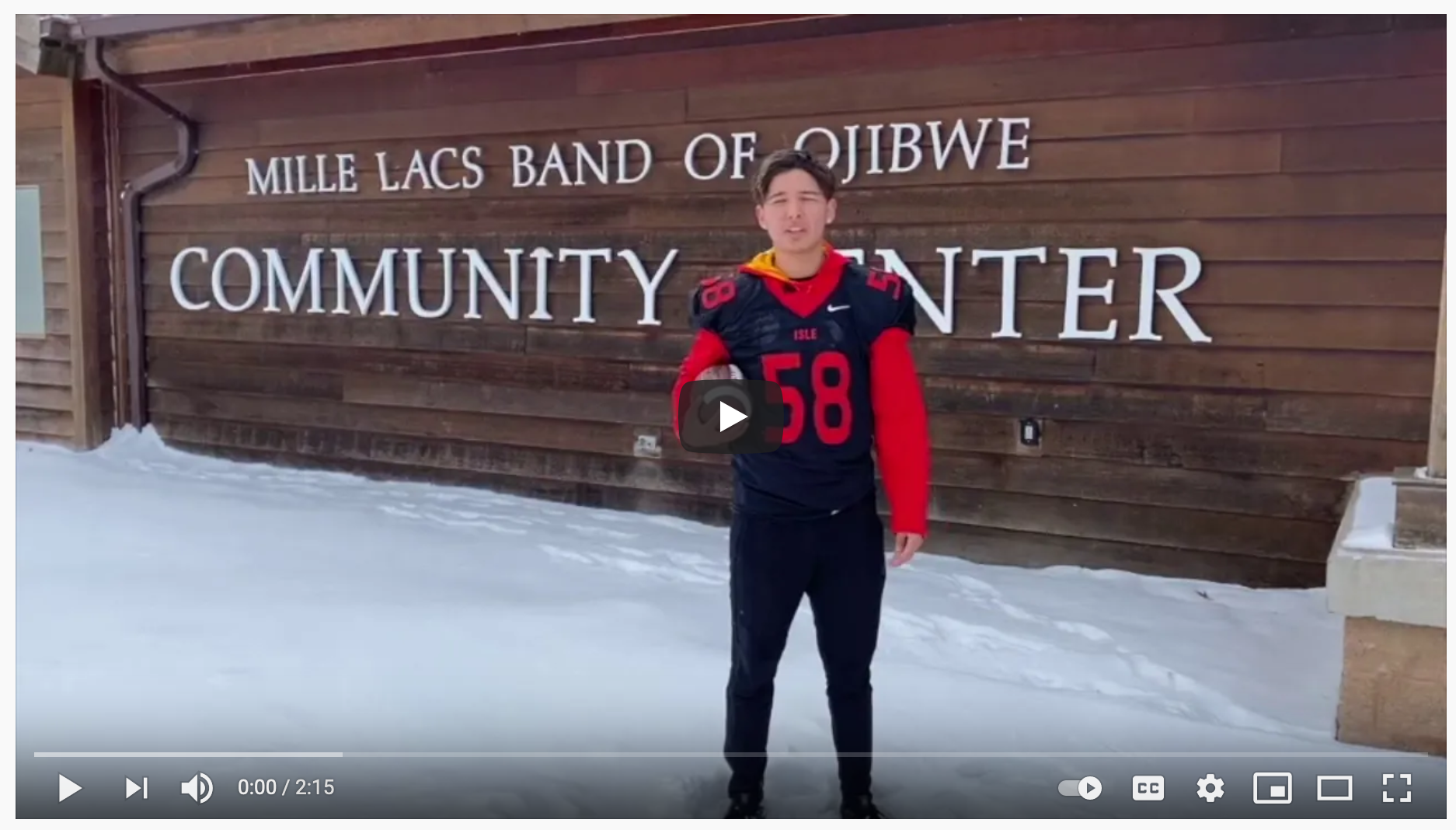 The Mille Lacs Band and two of its members participated in a video by the Arrowhead Regional Public Health and Tribal Health Departments including Aitkin, Carlton, Cook, Itasca, Koochiching, Lake and St. Louis counties together with the Bois Forte, Fond du Lac, Grand Portage, and Mille Lacs Bands of Ojibwe. Amelio Merrill and Derek Smith appeared in the video along with students from around the region. https://youtu.be/Y0_Y-XN1MVc