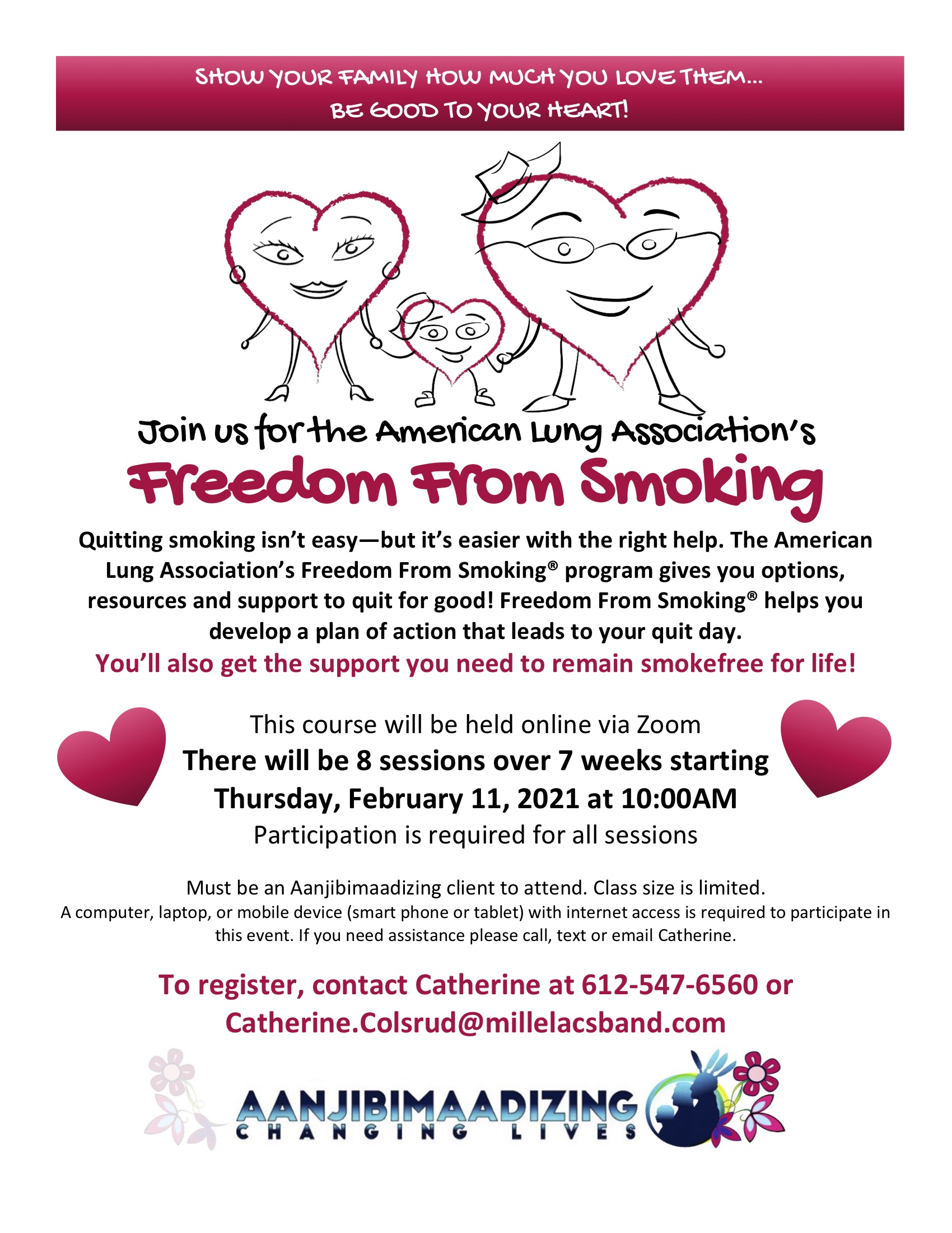Aanjibimaadizing is offering the American Lung Association’s Freedom From Smoking® program to Aanjibimaadizing clients via Zoom starting Thursday, February 11, 2021 at 10 a.m. There will be 8 sessions over 7 weeks. Participation is required for all sessions, and class size is limited. To register, contact Catherine at 612-547-6560 or Catherine.Colsrud@millelacsband.com. For more information, see https://millelacsband.com/news/freedom-from-smoking-course-offered-to-aanjibimaadizing-clients.