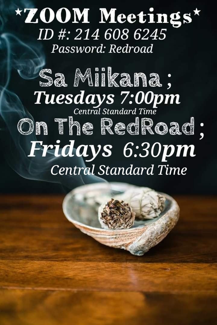 Most recovery meetings are held via Zoom conference during the COVID-19 pandemic. The Monday night Migizi meeting ID is 856 8473 0121, and the password is 56359. The Wednesday night Red Brick meeting ID is 895 631 97923, and the password is 56359. The Thursday Wellbriety meeting ID is 966 0395 9591, and the passcode is 944772. The nightly Zooming Towards Recovery code is 601-532-2869, and the password is zoom800. NOTE: ”The Rez” NA meeting starts at 6 p.m. at a new location: the old Ne-Ia-Shing Clinic, 43500 Migizi Drive.