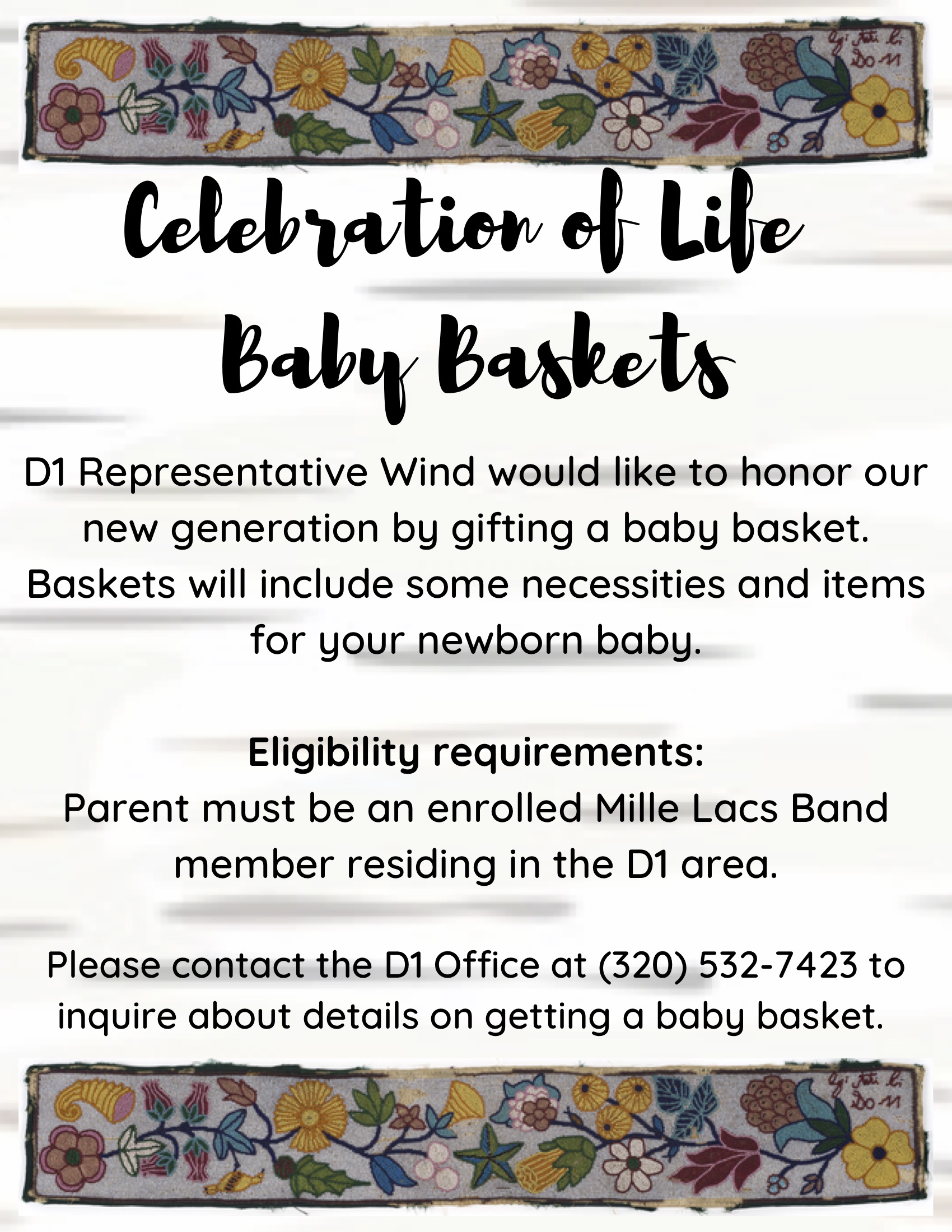 District I Representative Virgil Wind would like to honor our new generation by gifting a baby basket. Baskets will include some necessities and items for your newborn baby. Parents receiving baskets must be an enrolled Mille Lacs Band member residing in the District I area. Please contact the D1 Office at (320) 532-7423 to inquire about details on getting a baby basket.