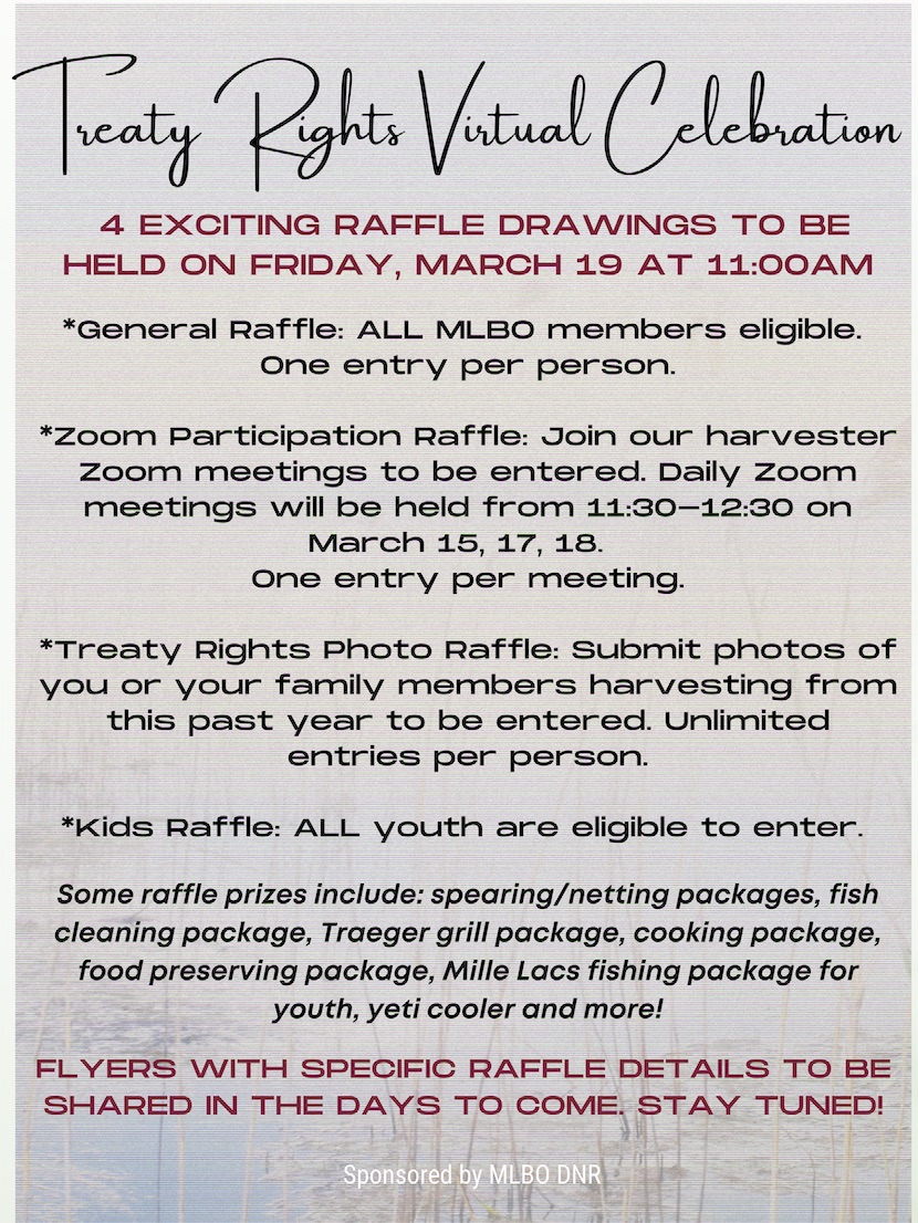 Treaty Rights Day will be celebrated on March 19 in commemoration of the U.S. Supreme Court decision affirming our rights to hunt, fish, and gather under the 1837 Treaty. Government Offices close at noon. Stay tuned for information on the virtual celebration hosted by the Department of Natural Resources. See the flyers above and below for information on raffles.