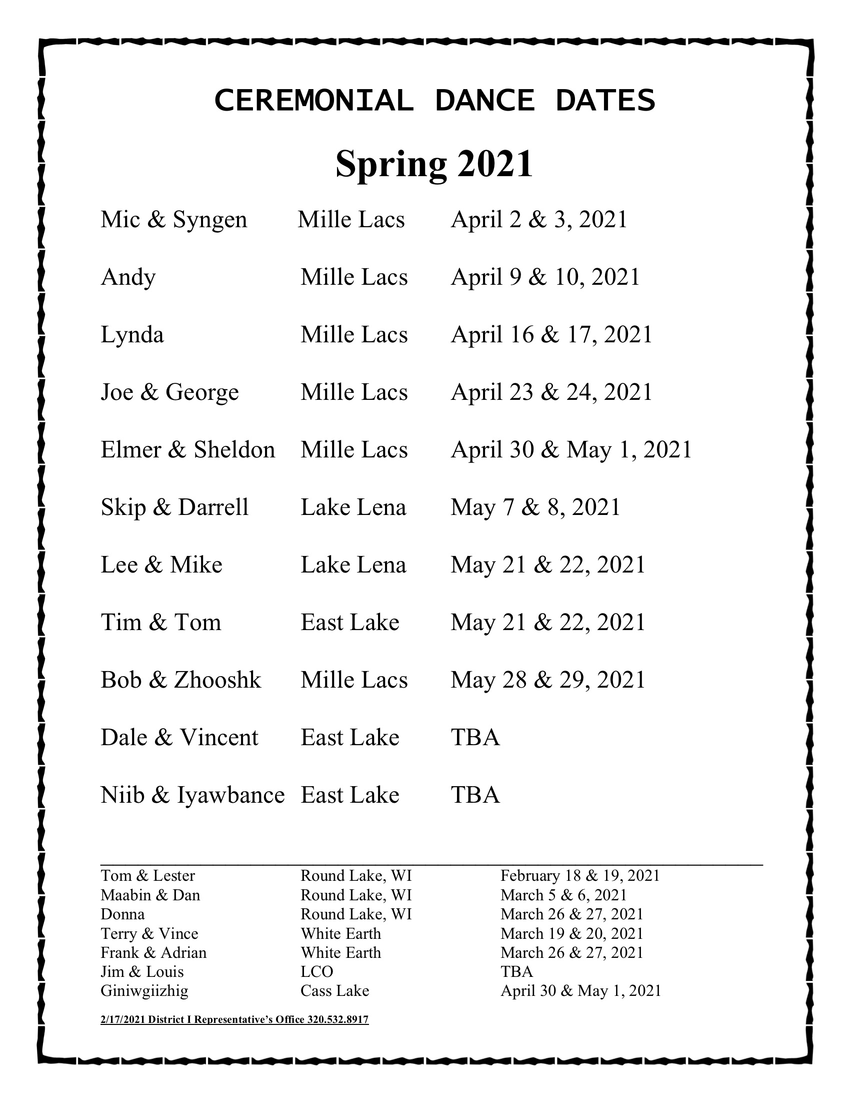 Beginning March 1, Band member families are invited to share memorial tributes to loved ones who have passed away for publication on the website and in the Ojibwe Inaajimowin. Mekweniminjig — Those Who Area Remembered — will be published in the newsletter beginning in April and can be found on the website at https://millelacsband.com/news/mekweniminjig. If you lost a loved one this year and would like to share the information with the Mille Lacs Band community, send the obituary/tribute along with a photo if desired to news@millelacsband.com to be included on the website and in the next issue of Ojibwe Inaajimowin.