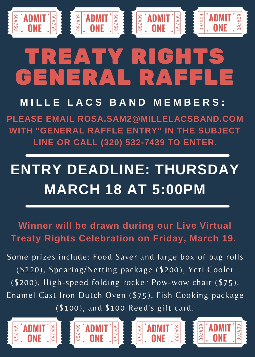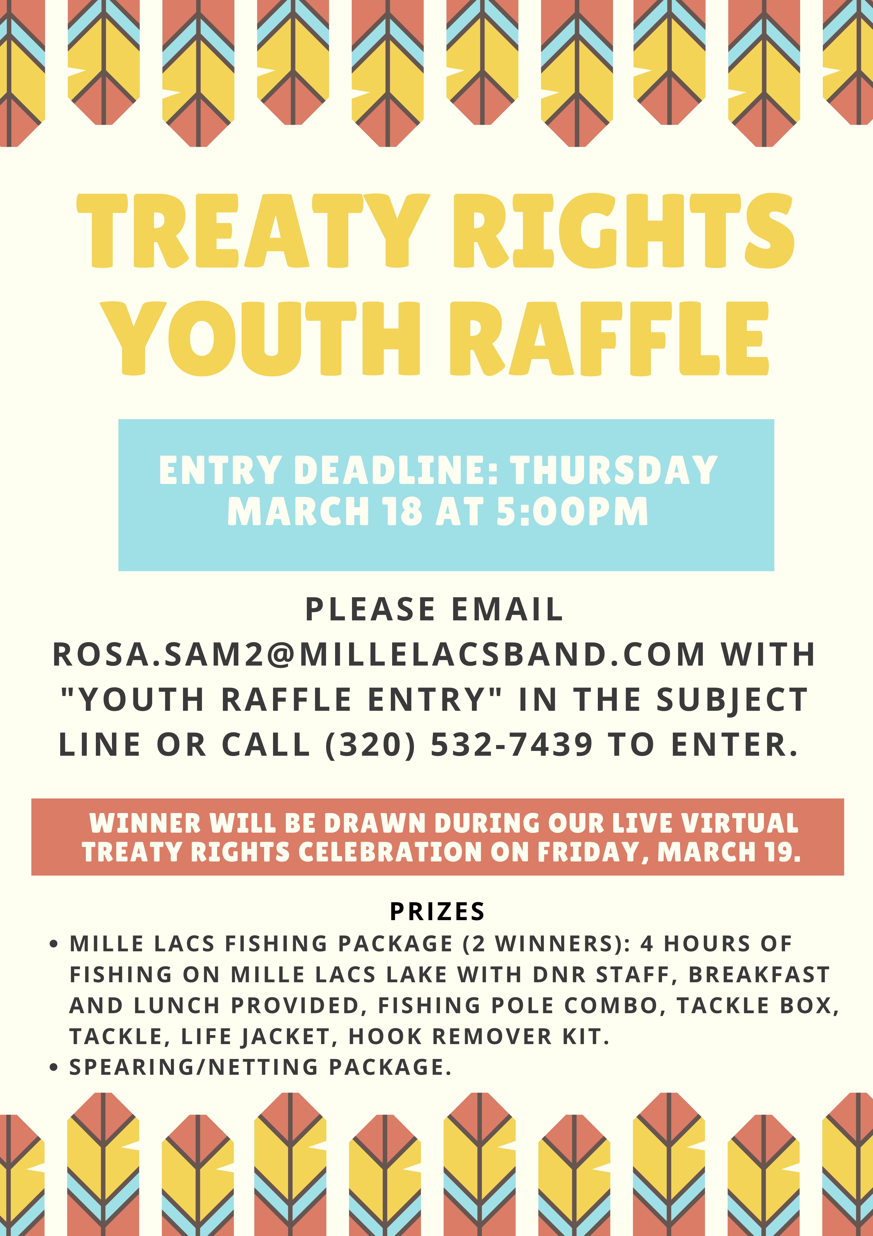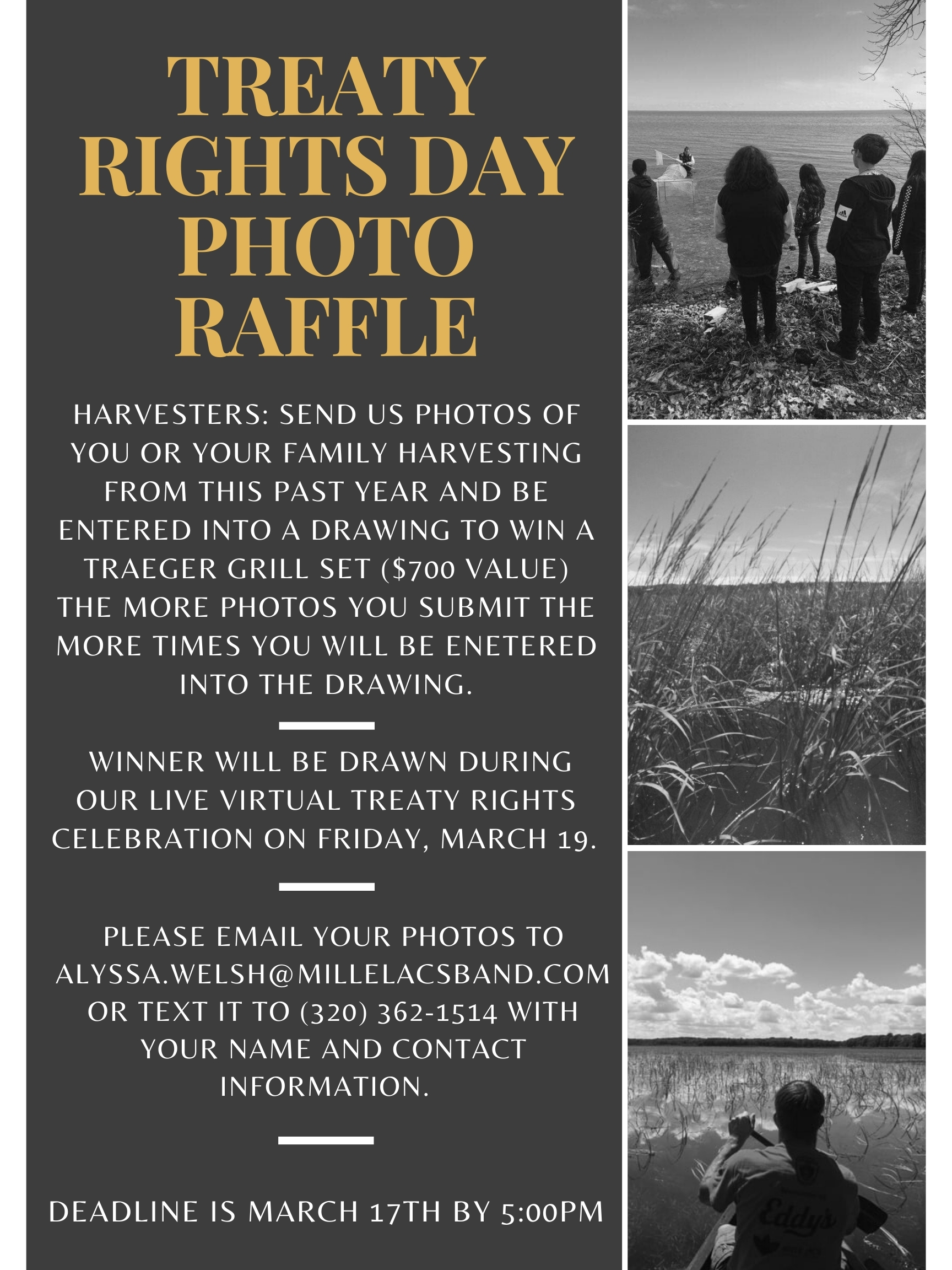 The Mille Lacs Band Department of Natural Resources will host harvester meetings March 15-18 followed by a raffle drawing for participants beginning at 11 a.m. on March 19 at the Treaty Rights Day virtual celebration. Harvester meetings will take place from 11:30 a.m. to 12:30 p.m. on the following dates:
