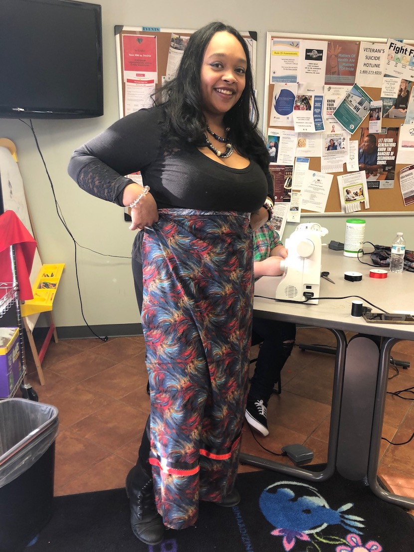 Another attendee, Brittany Stewart, took the class so she could learn how to make a skirt for herself and now has plans to make skirts for her sister and aunties. She changed her mind a few times about the color pattern and fabric she wanted, but finally landed on a black fabric with feather-like pattern that she adorned with red and black ribbons.
