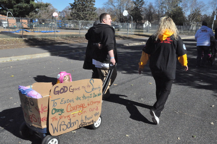 During a rest stop at a local school, Randell Sam led participants in a recitation of the Serenity Prayer and a chant of “There is hope! Ask us how!“ while children swarmed the playground equipment.