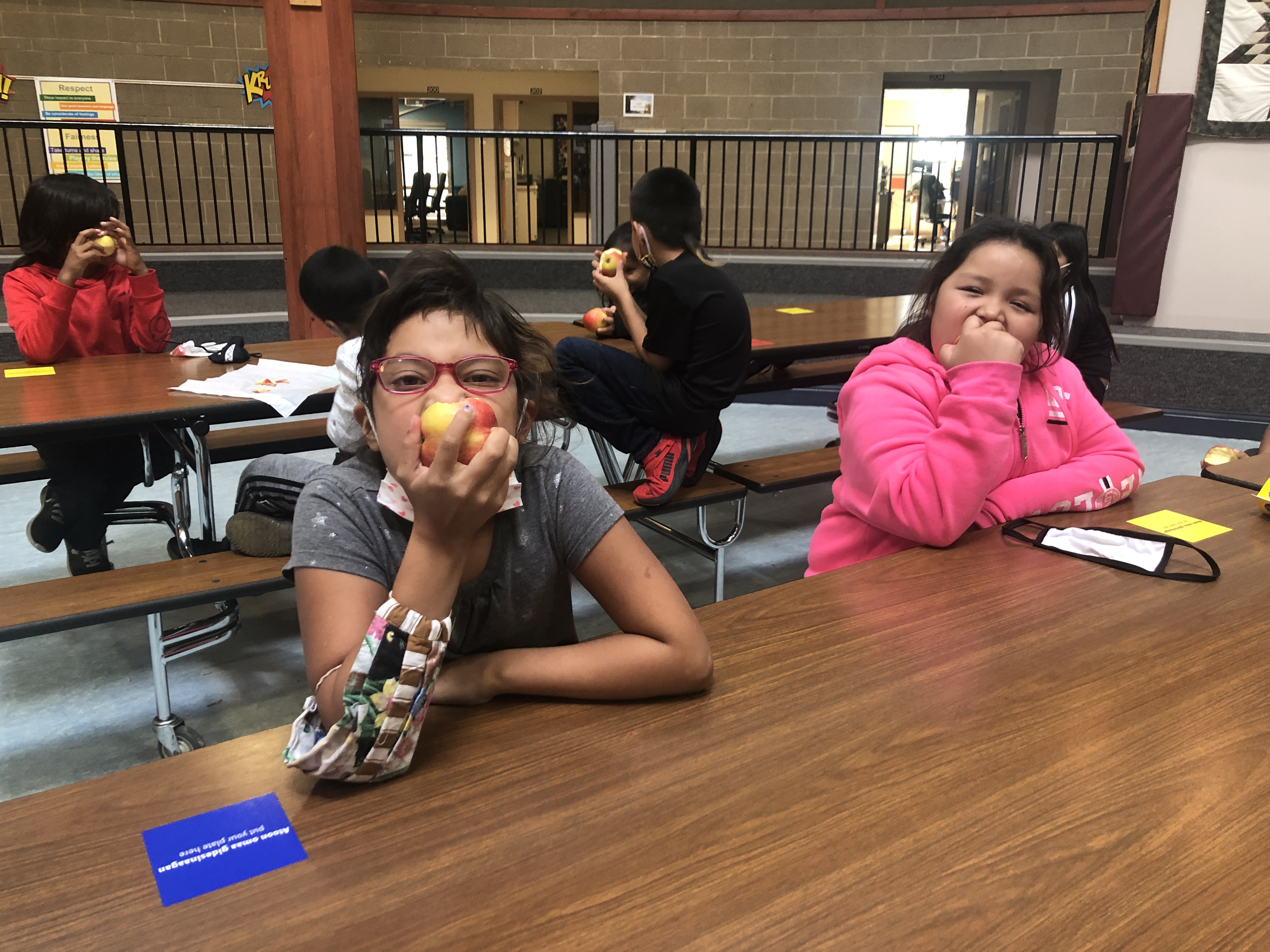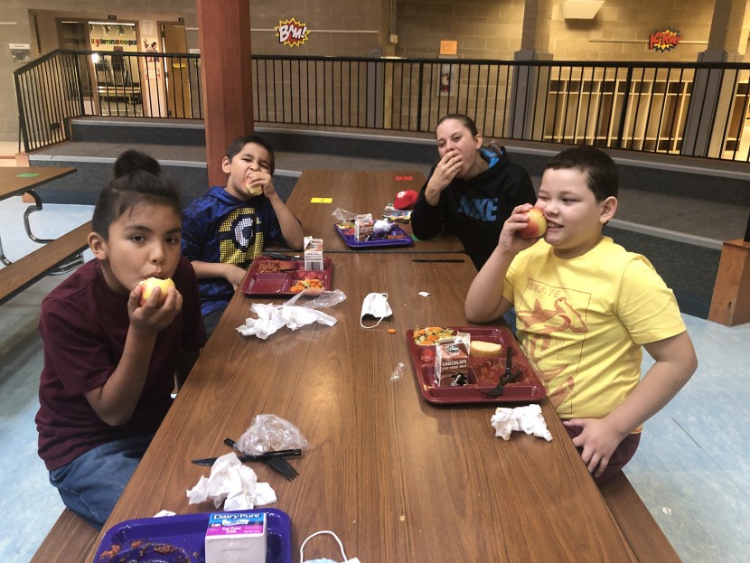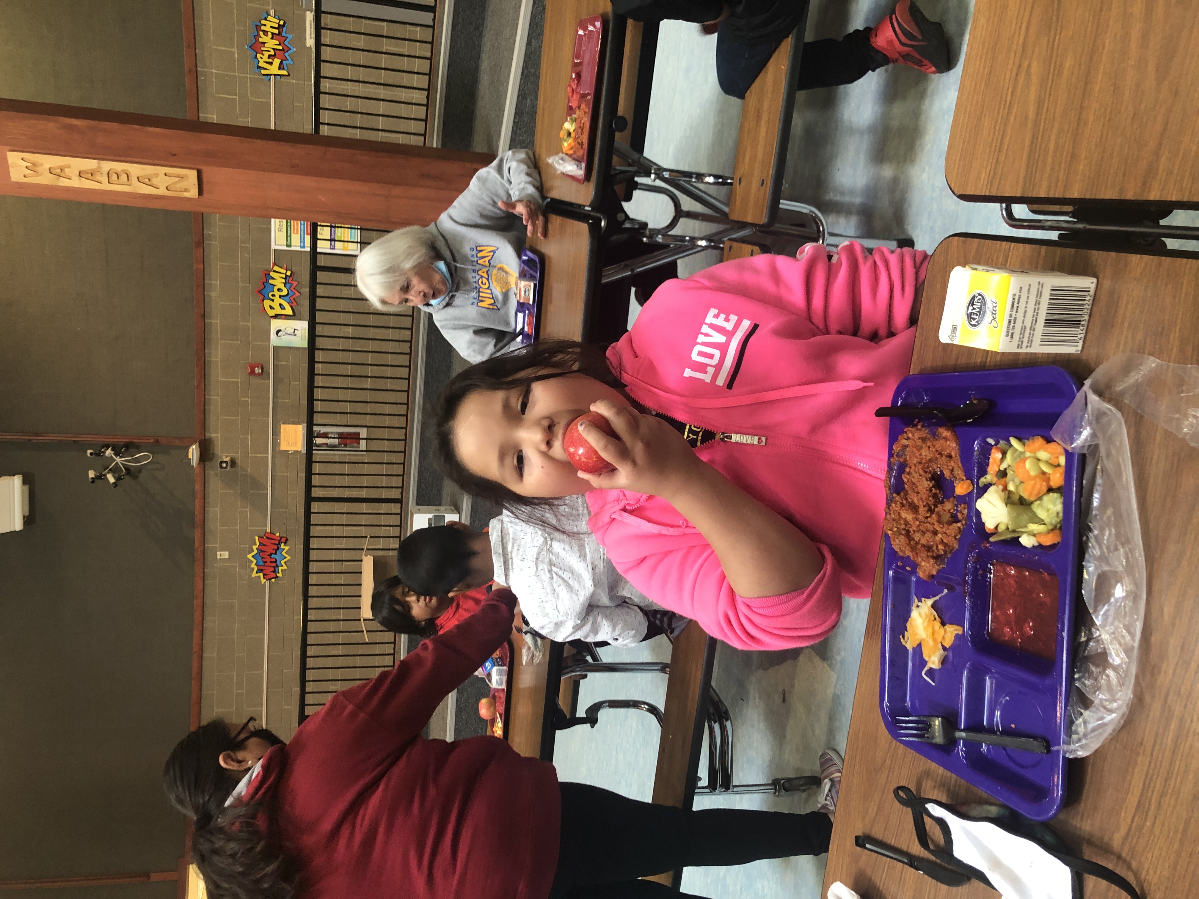 Nay Ah Shing and Pine Grove students celebrated National Farm to School Month by crunching into locally and regionally grown apples on Thursday, October 8. Pine Grove students joined their Nay Ah Shing colleagues via interactive TV. K-12 schools from Minnesota, Wisconsin, Illinois, Indiana, Michigan, and Ohio participated in lunchrooms, classrooms, and online. On October 1, 2019, 815,331 students, children, teachers, and good food supporters across the region crunched together to recognize the importance of healthy, local foods. Nay Ah Shing/Pine Grove Nutrition Services Coordinator Deborah Foye coordinated the effort in our schools, with help from Mary Pyawasit. Miigwech, Deb and Mary!
