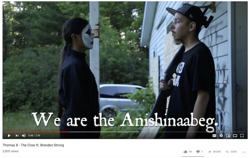 Thomas’s first experiment with rapping over a hand drum led him to produce another video based loosely on his favorite movie, ”The Crow,” and set to a crow hop beat. Like ”Rezolution,” the video includes a passage in Anishinaabemowin and images of dancers, but it also shows the harsh reality of drug addiction. Thomas also raps in Ojibwe about the Seven Values.