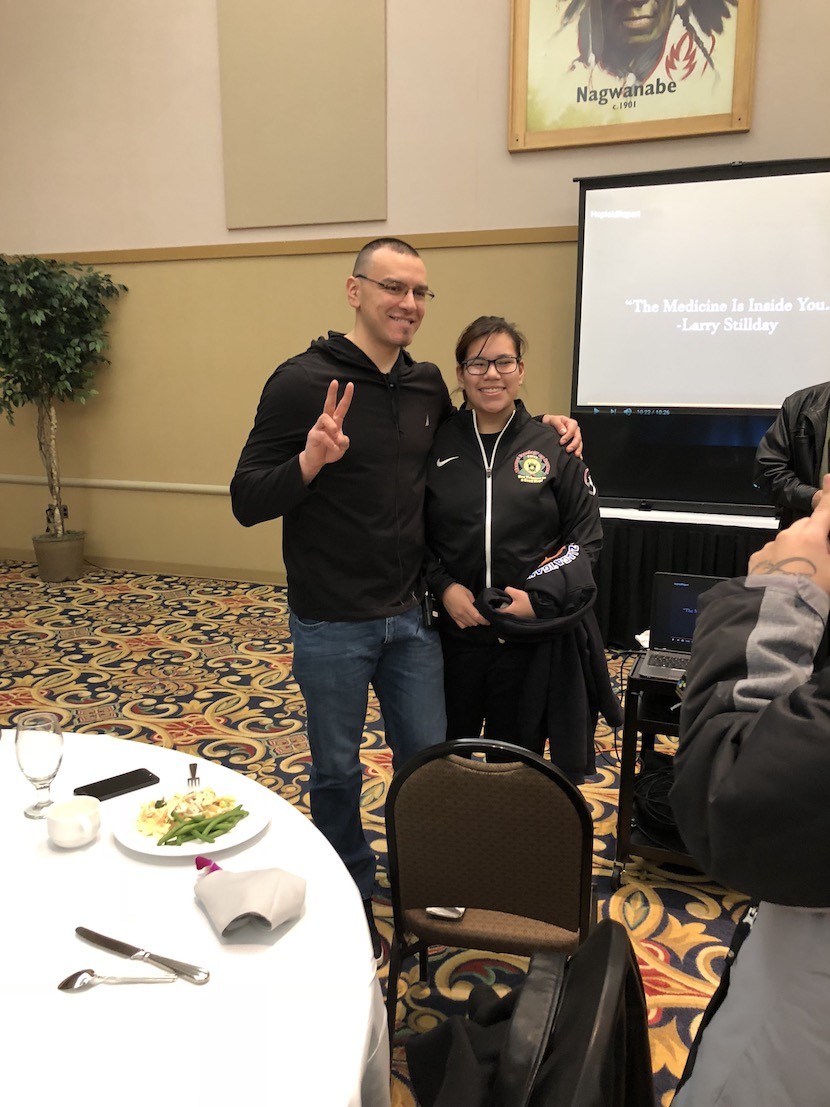 Above: Thomas X visited with Nay Ah Shing student Shakoka Smith after his presentation in District I on December 6. Below: An image from the video of ”The Crow,” a rap song about the role of culture in overcoming addiction.