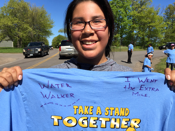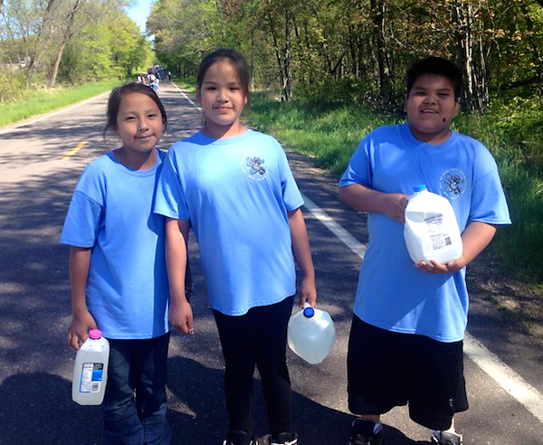 Nay Ah Shing School students and staff on the Mille Lacs Band of Ojibwe Reservation went the extra mile to increase awareness of local and global water issues on Friday, May 22. After participating in a 1-mile fun run event, those who wanted to “go the extra mile” picked up a gallon (or two) of water and continued for another mile in an effort to experience in a small way what many people – mostly girls – must do every day to bring water to their families in Tanzania and many parts of Africa. In fact, one of the Ojibwe teachers recalled that as a small girl she also had to carry water from Mille Lacs Lake for her family every day – there are deep and meaningful connections.