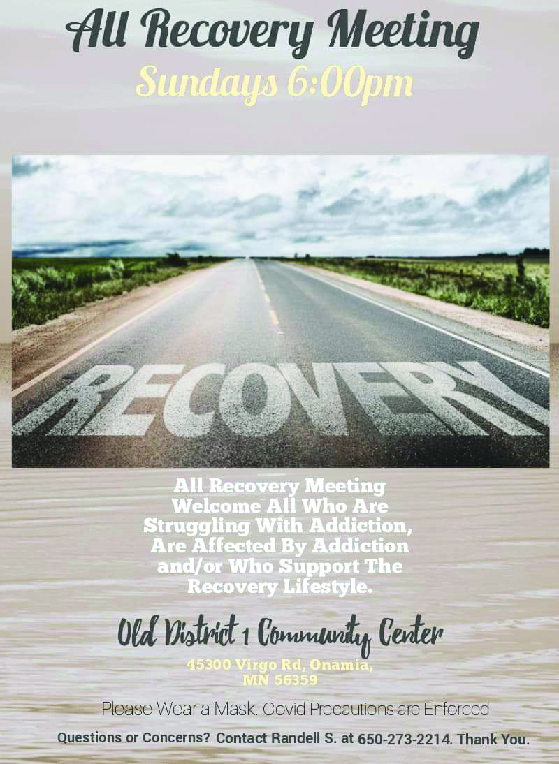 Two new recovery groups will be starting up at the old District I Community Center this week: An NA meeting on Fridays at 6 p.m. and an All Recover group on Sundays at 6 p.m. Contact Randell S. with questions at 650-273-2214. (See flyers below.)