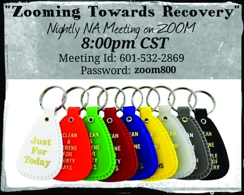 Many recovery meetings are also held via Zoom conference during the COVID-19 pandemic. The Monday night Migizi meeting ID is 856 8473 0121, and the password is 56359. The Wednesday night Red Brick meeting ID is 895 631 97923, and the password is 56359. The nightly Zooming Towards Recovery code is 601-532-2869, and the password is zoom800.