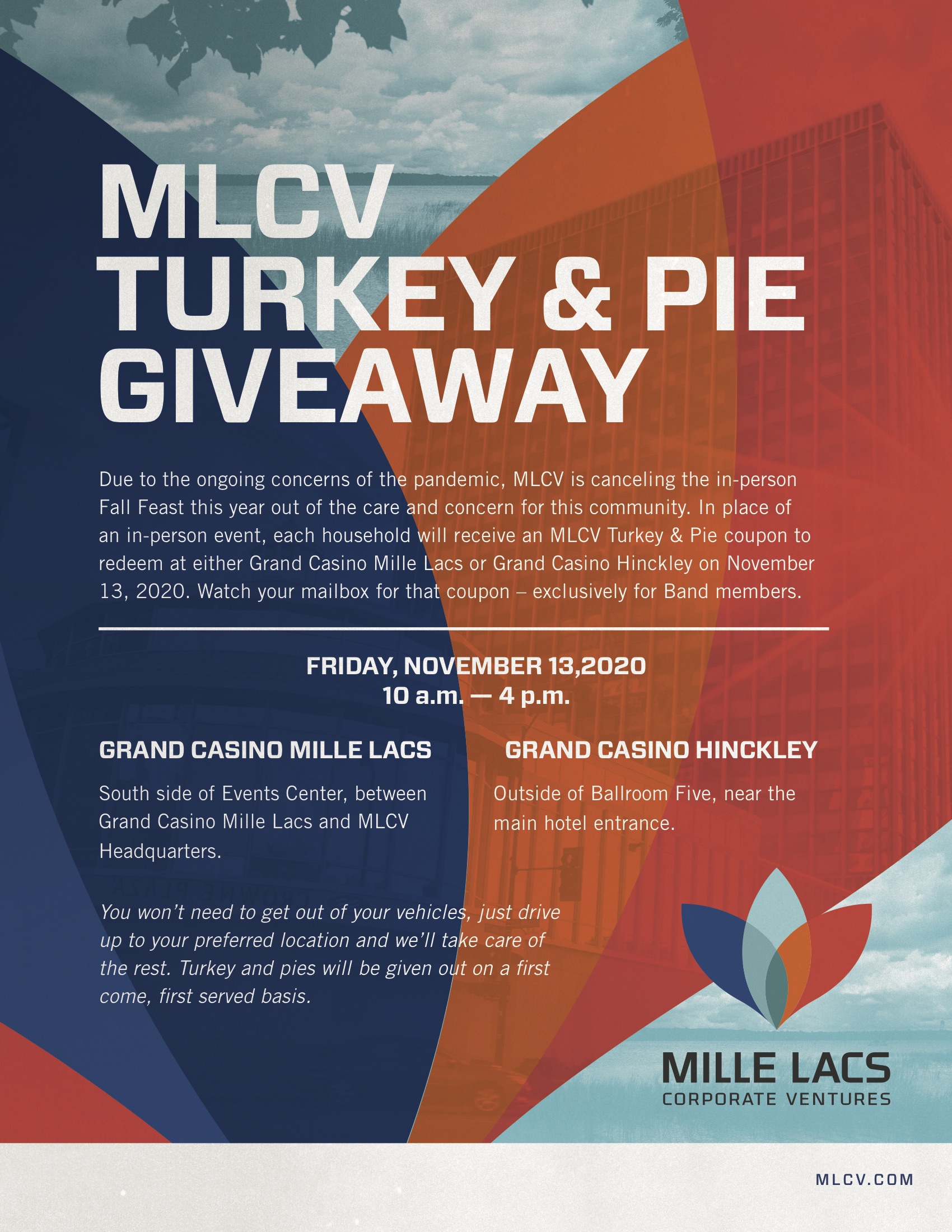 Due to the ongoing concerns of the pandemic, MLCV is canceling the in-person Fall Feast this year out of the care and concern for this community. In place of an in-person event, each household will receive an MLCV Turkey & Pie coupon to redeem at either Grand Casino Mille Lacs or Grand Casino Hinckley on November 13, 2020. Watch your mailbox for that coupon – exclusively for Band members.