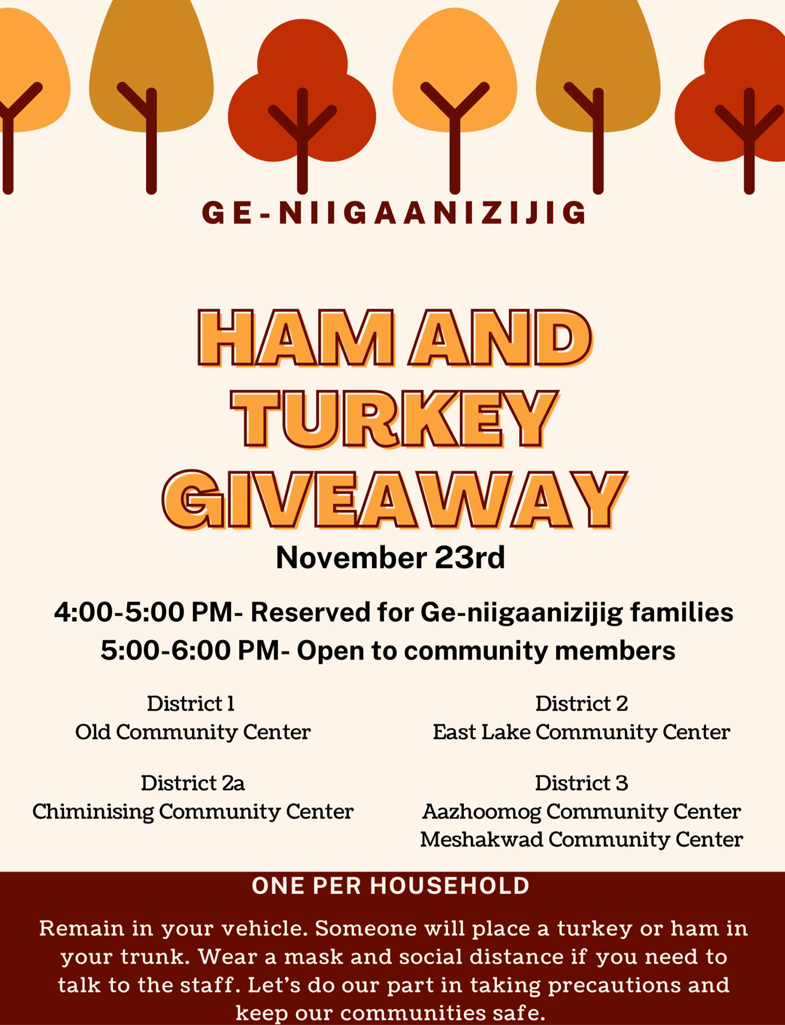 Ge-Niigaanizijig Ham and Turkey giveaway is November 23 from 4-5 p.m. at the old community center in District I and at community centers in Chiminising, East Lake/Minisinaakwaang, Aazhoomog, and Hinckley (Meshakwad Community Center). Families enrolled in the Ge-niigaanizijig program will be served from 4 to 5 p.m. From 5-6 p.m., the event is open to all community members. See flyer below for more information.