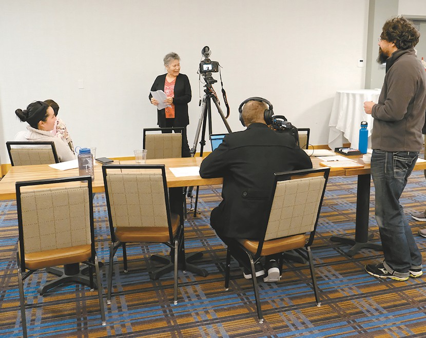 Elders Shirley Boyd, Bette Sam, Carol Hernandez, and William Premo read for the parts of Waabooz and Waabishkibines — the grandmother and grandfather characters.
