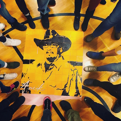 The next session was the tile art project. The end result was kept a secret to the youth. As they were painting, many of them were trying to guess what they were painting; guesses ranged from a map to a galaxy. When the tiles were all put together, a wonderful feeling fell across the room as members of Amik’s family, Ge-niigaanizijig staff, community members, and youth realized that they had created a painting of Amik.