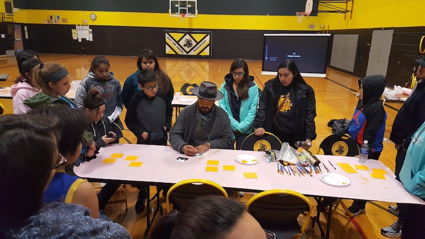 He went on to show the kids his art creations that ranged from Mindians (an artistic play on the Minions) to photo pop art in which he overlayed images of Godzilla into old photos of teepee villages. He stressed the importance of seeing Native faces represented not only on TV but in art and advertising as well.