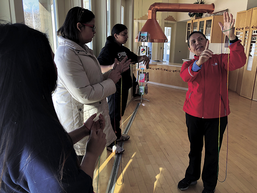 On Thursday, February 7, Onamia kids got to travel by snowshoe around the museum grounds as they learned winter lore from staff and guests. They watched Mike Wilson skin a beaver, played traditional games with Drs. Dan and Susan Ninham, made asemaa pouches with Linda Ulrick and Paula Maday, learned about winter from Kathio Park Naturalist Erin Fallon, and practiced making cordage with Kaitlin Thompson of the Minnesota Historical Society.