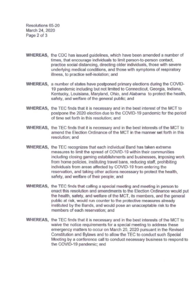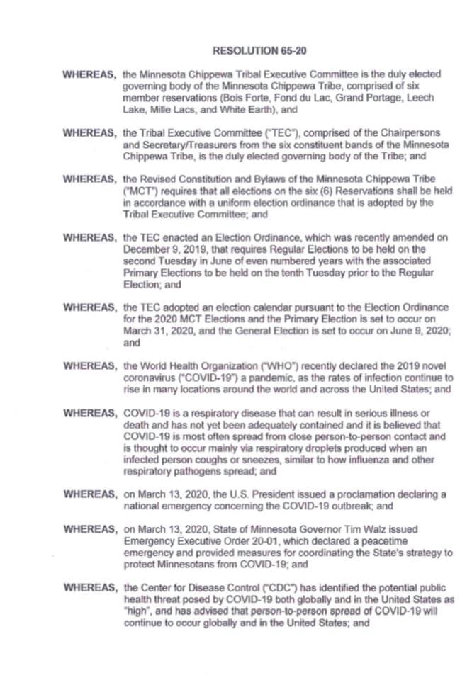 Mille Lacs Band of Ojibwe Chief Executive Melanie Benjamin signed an Executive Order on Sunday, March 15, declaring that the Band is in a State of Emergency, while the Band Assembly — composed of Secretary/Treasurer Sheldon Body and District Representatives Sandra Blake, Marvin Bruneau, and Wally St. John —passed Ordinance 27-20, The Emergency Management Act, establishing Title 27 within the Mille Lacs Band Statutes Annotated. Title 27, which will be titled Emergency Management, gives the Chief Executive authority to carry out certain emergency measures necessary to ensure the health and well-being of Band Members.