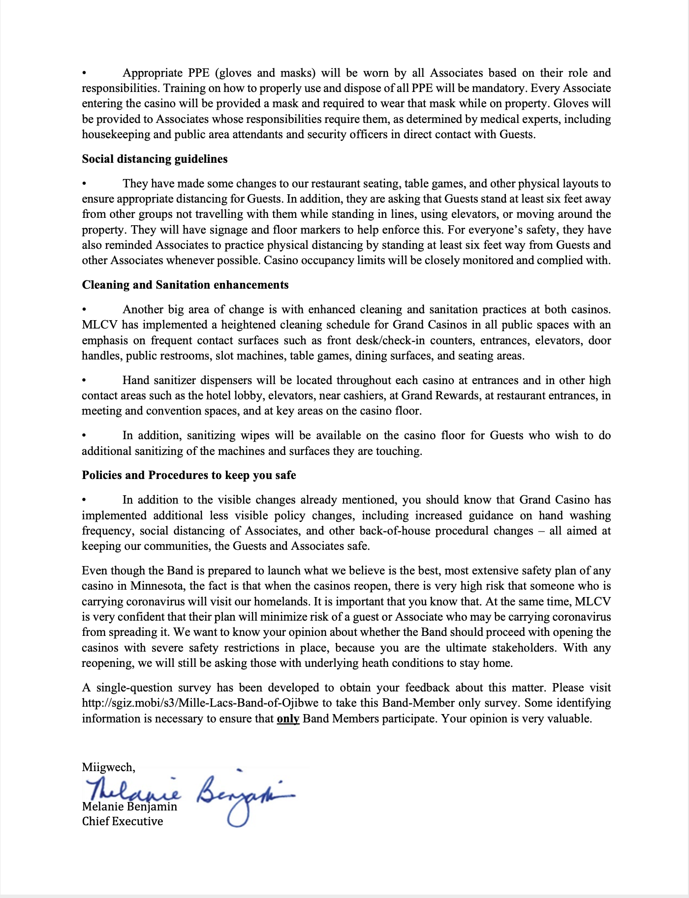Mille Lacs Band of Ojibwe Chief Executive Melanie Benjamin provides an update for Band members regarding COVID-19. Even though state-wide restrictions are slowly lifting Chief Executive Benjamin echoed Governor Walz who said, "COVID is still with us, but we've have to live with it." Personal safety protocols are still encouraged, including wearing masks.